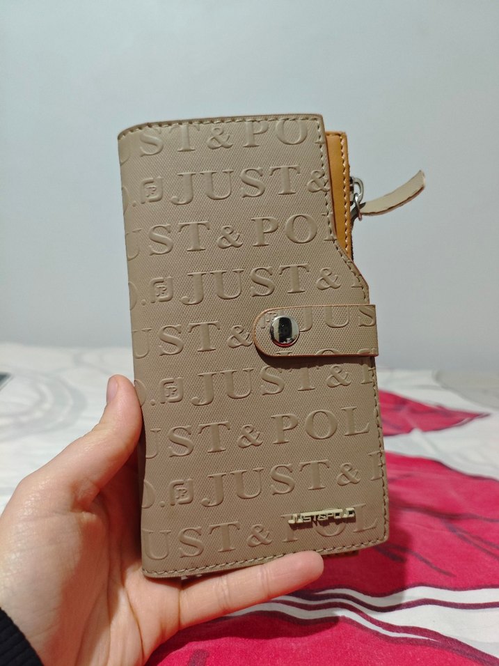 Bej renkte, fermuarlı ve baskılı minimal desenli deri kadın cüzdan. Günlük kullanım ve şık sokak tarzına uygun.