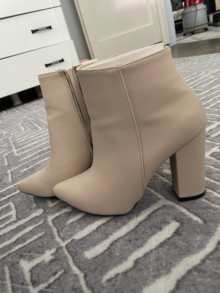 Bej deri, blok topuklu ve fermuarlı kadın botu, düz ve desensiz tasarımıyla günlük kullanıma uygundur.