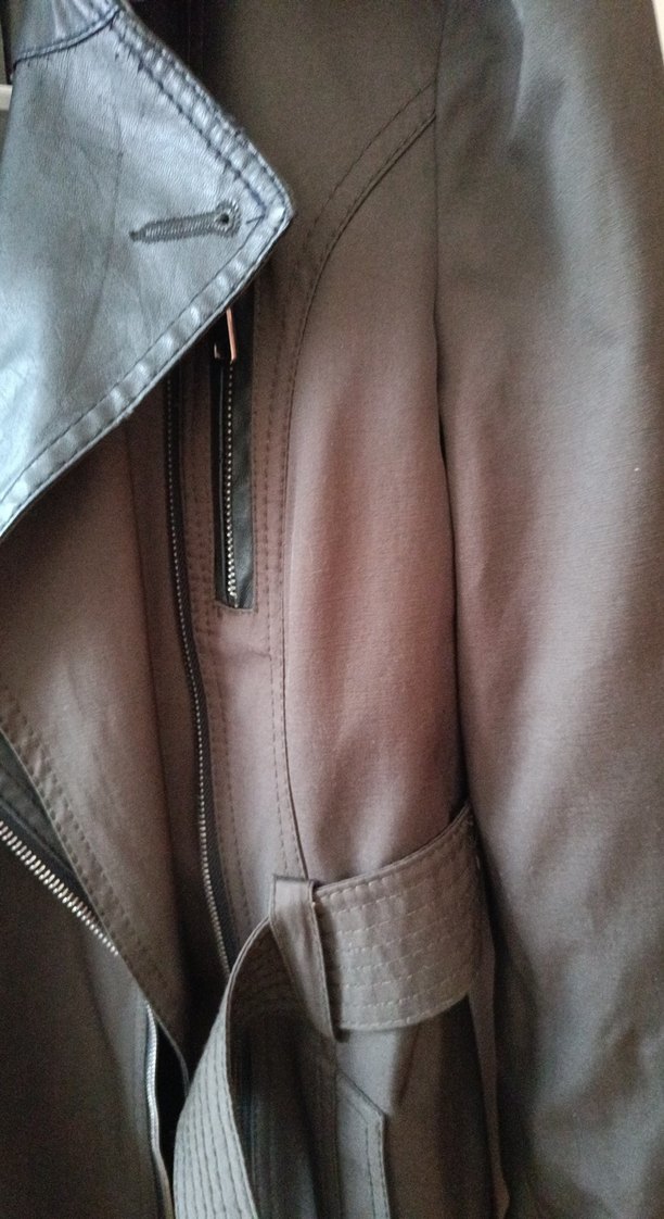 Bej deri fermuarlı, yakası kesik, askılı kollu, fitted kesim midi uzunlukta kadın trençkot. Biker tarzıyla şık bir görünüm sunar.
