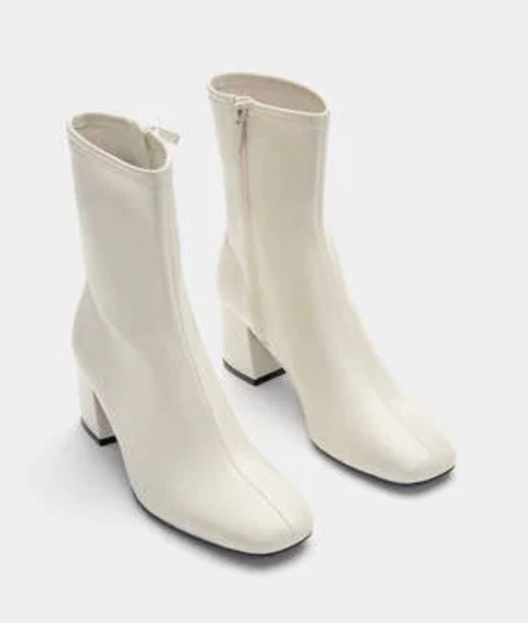Beyaz deri, blok topuklu ve fermuarlı bu botlar, minimalist ve trend sokak stili için uygundur.