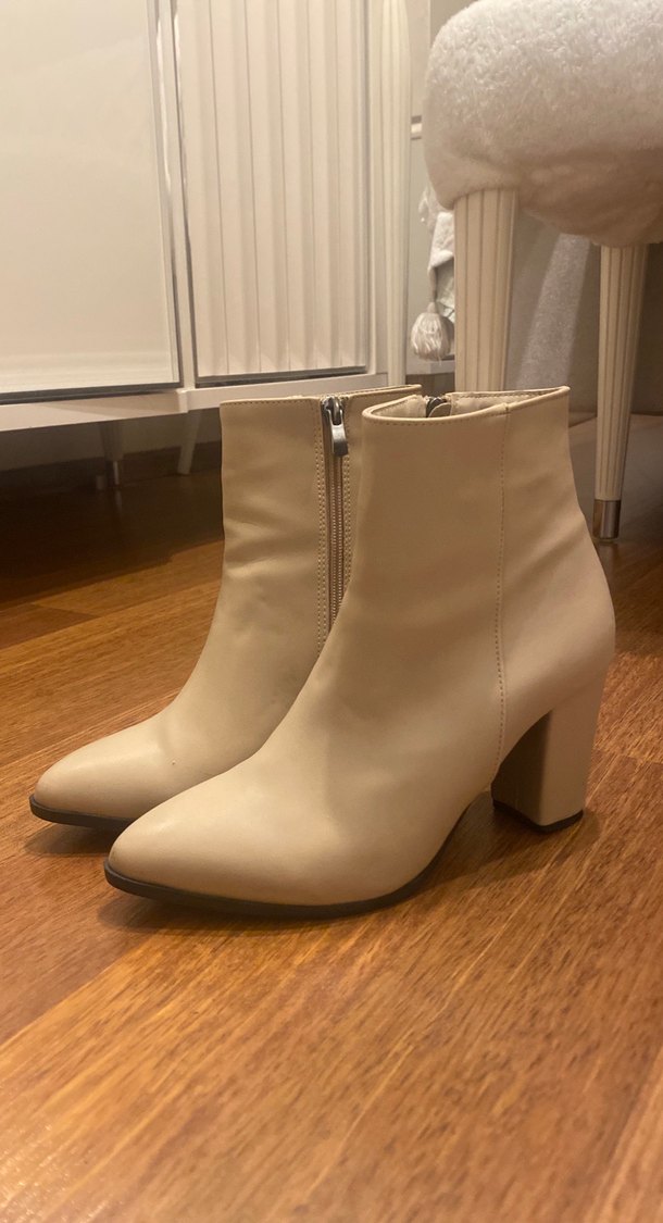 Bej deri kadın botları, blok topuk ve yan fermuar detayına sahiptir, günlük kullanıma uygun minimalist tarzda.