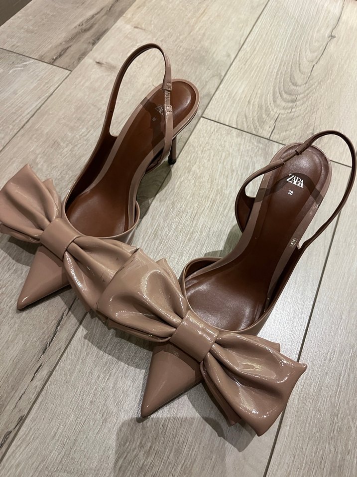 Bej deri stiletto topuklu ayakkabılar, büyük fiyonk detaylı, sivri burunlu ve arka bantlı tasarıma sahip. Romantik akşamlar için uygun.