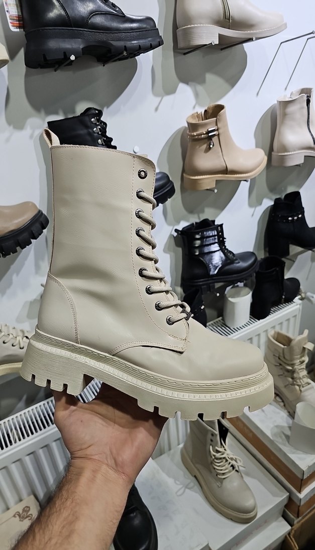 Bej renkli deri botlar, kalın topuk ve bağcıklı tasarıma sahip, kemerli detaylarla tamamlanmıştır. Günlük sokak stili için uygundur.