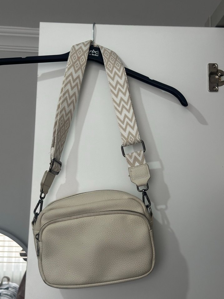 Bej deri kadın bel çantası, geniş desenli kemer askısı ve çift fermuarlı bölmeleriyle günlük sokak stiline uygun.