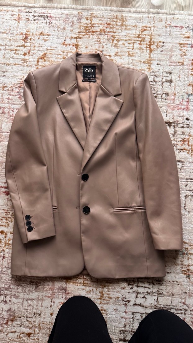 Bej renkli, düğmeli, uzun kollu deri kadın blazer ceket. Normal kesim ve kesik yaka detaylı, ofis ve günlük kullanıma uygundur.