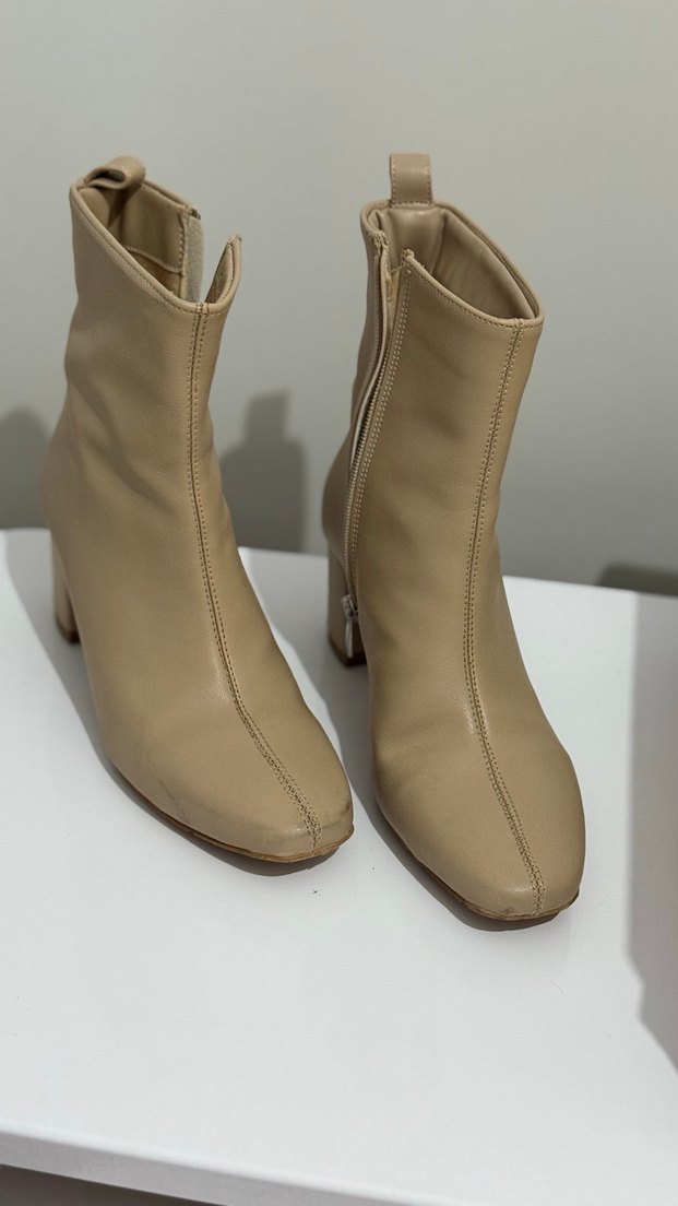 Bej deri kadın bot, blok topuklu ve minimalist tasarıma sahip. Günlük kullanıma uygun, rahat ve şık pastel tonlarda.