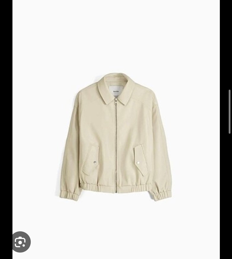 Bej deri bomber ceket, uzun kollu, yakası kesik ve düğmeli ceplidir. Rahat kesimi ve oversize gorunumuyle günlük sokak stiline uygundur.