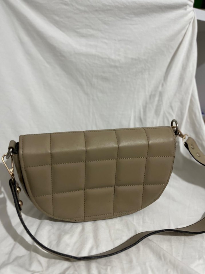 Bej deri kadın çanta, kemerli tasarımı ve desensiz yüzeyiyle günlük şıklık için uygun.