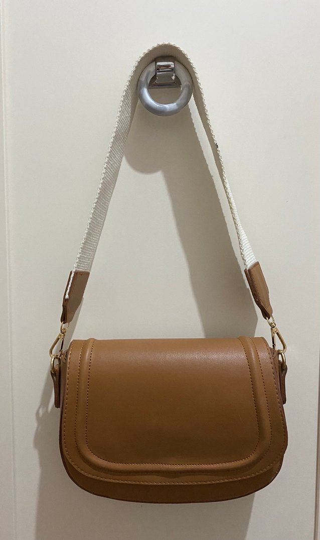 Bej deri çanta, kemerli tasarımı ve modern klasik stiliyle sade ve günlük kullanıma uygundur.