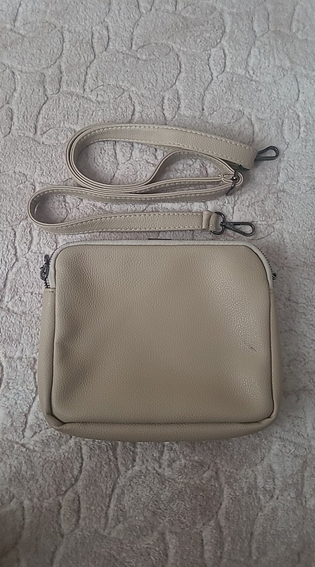 Bej deri kadın çanta, fermuarlı tasarıma sahip ve çıkarılabilir askı ile birlikte. Minimalist, desensiz stili günlük sokak kullanımı için uygun.