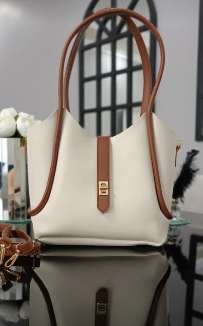 Bej renkli deri kadın çanta, tokalı askısı ve sade tasarımıyla modern klasik stil sunar. Günlük kullanıma uygun, şık ve zarif bir modeldir.