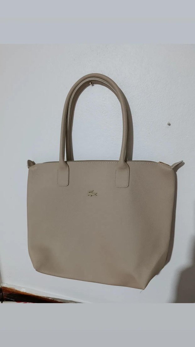 Bej deri kadın çanta, fermuarlı kapama ve minimalist, çağdaş tasarıma sahiptir. Gri tonlarda, desensiz yüzeyiyle günlük kullanıma uygundur.