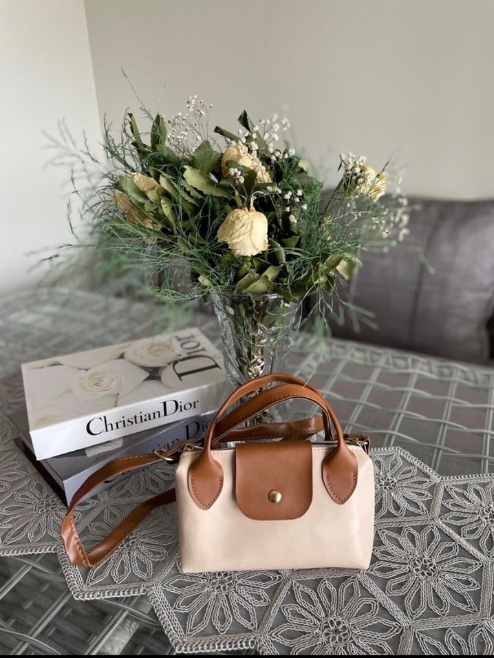 Bej renkli deri kadın çanta, çiçek desenli ve çağdaş tasarımlı. Günlük kullanıma uygun, zahmetsiz şıklığı ve klasik zarafeti yansıtıyor. Christian Dior imzalı.markası belirsz