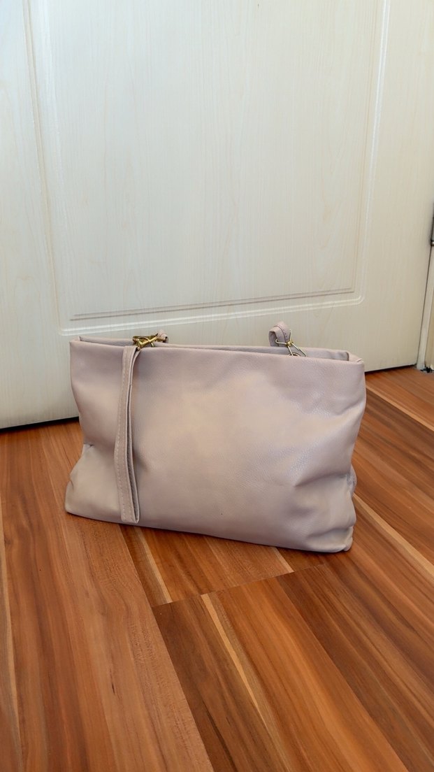 Bej renkli deri kadın çanta, fermuarlı kapama ve minimalist, çağdaş tasarıma sahiptir. Pastel tonu ve desensiz yüzeyiyle sade, temel bir görünüme sahiptir, günlük kullanım için uygundur.