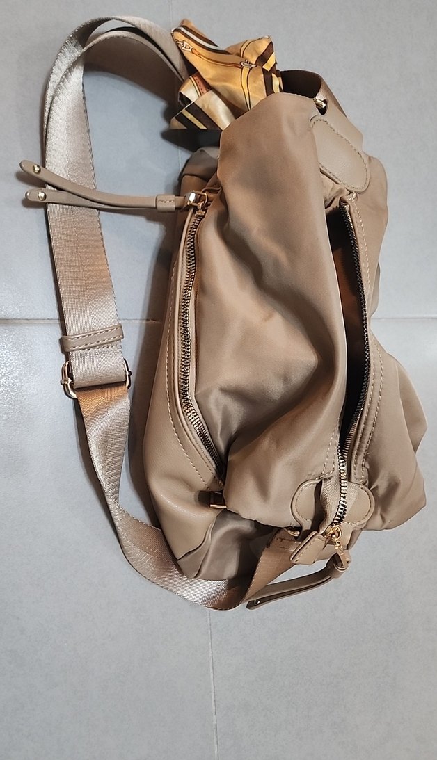 Gri ayarlanabilir askılı bej deri kadın çanta, fermuarlı bölmelere sahip. Minimalist ve çağdaş tasarımıyla günlük kullanım için uygundur.