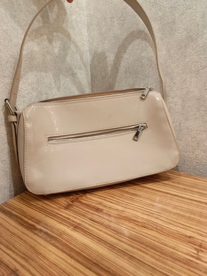 Bej renkte, fermuarlı ve pastel tonlarda deri kadın çanta, günlük kullanıma uygun şık ve modern tasarım.