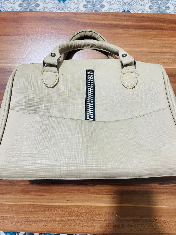 Bej deri kadın çanta, fermuarlı ön cepli, sade ve çağdaş tasarıma sahip, günlük kullanıma uygun. Minimalist ve gri tonlarda.