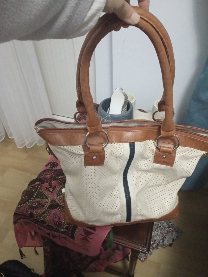 Bej deri, fermuarlı kadın çanta. Bohem tarzda, desensiz, günlük kullanıma uygun, Paris etkili şık tasarım. ufak deformeleri mevcut kullanıma mâni değildir
