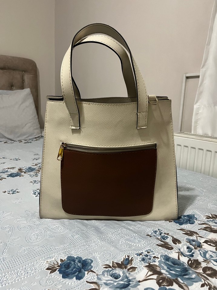 Bej deri kadın çanta, önünde fermuarlı cep bulunur. Çağdaş Paris tarzı detaylara sahiptir. Günlük kullanıma uygundur.