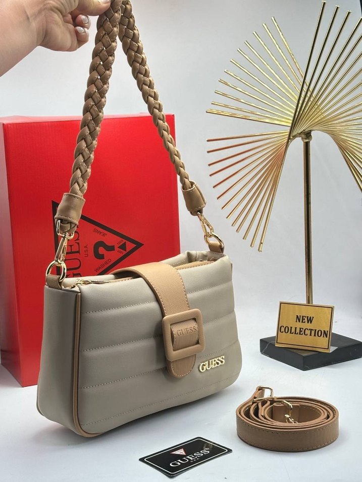 Guess markalı, bej deri kadın çanta. Modern klasik tarzda, baskılı desenli ve tokalı flaplı. Örgü saplı ve ekstra askılı, günlük kullanıma uygun.