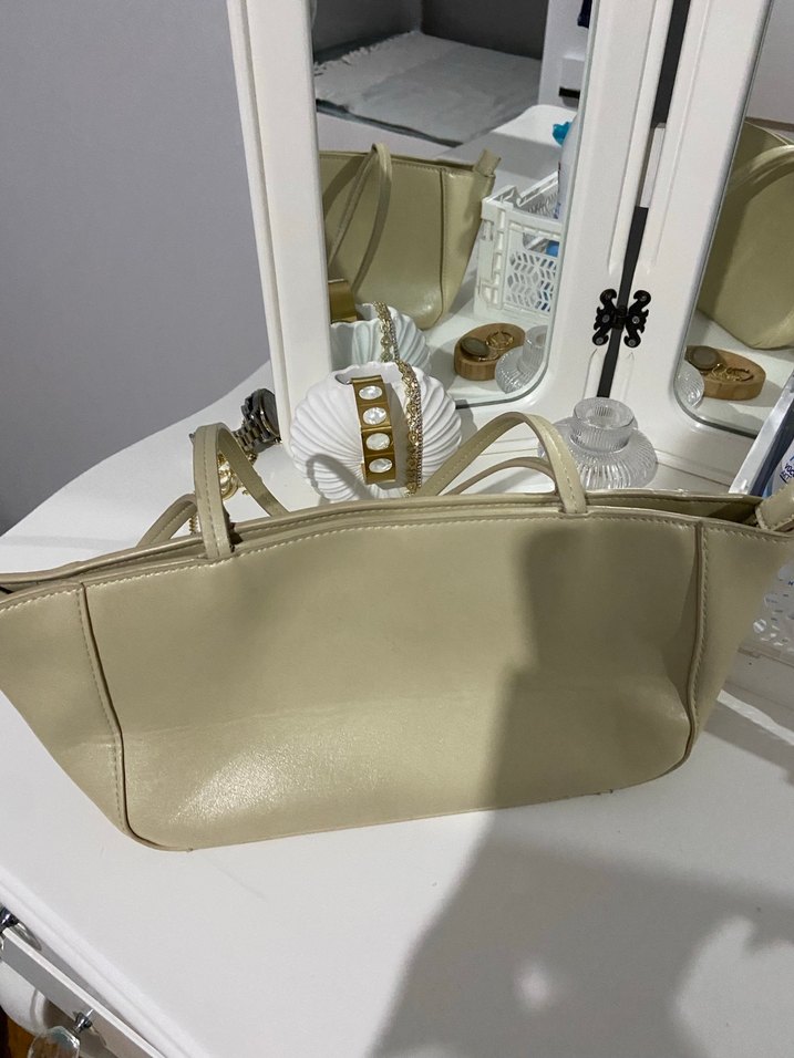 Bej deri çanta, fermuarlı ve minimalist tasarıma sahip. Günlük kullanım için uygun, çağdaş ve klasik şıklıkta.