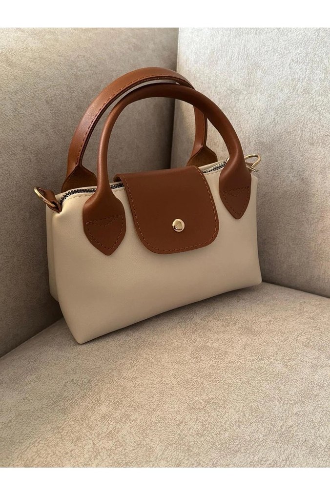Bej deri çanta, kahverengi tokalı sapları ile minimalist tasarıma sahiptir. Günlük kullanım için uygundur, desensiz ve çağdaş tarzda şık bir seçimdir. Marla temsilidir