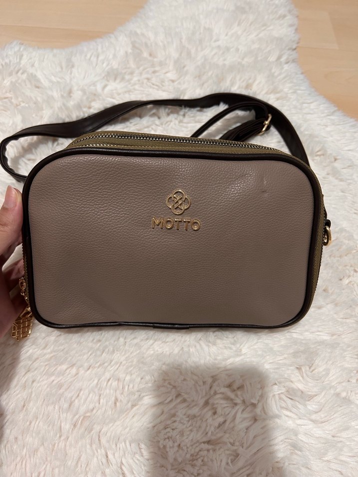 Fermuarlı kapama ve baskılı tasarıma sahip bej deri kadın çanta. MOTTÖ marka ve modern klasik tarzda, trend günlük kullanım için uygun.