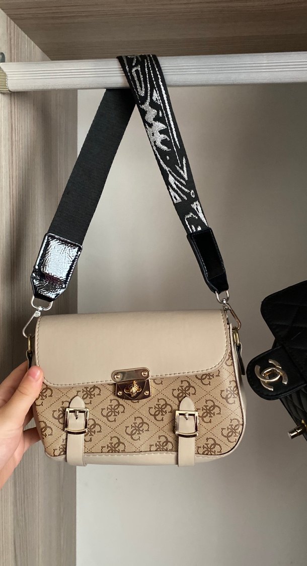 Bej deri kadın çanta, tokalı kayışlar ve yılan derisi desenli detaylarla; trend sokak stili ve günlük kullanım için uygun.