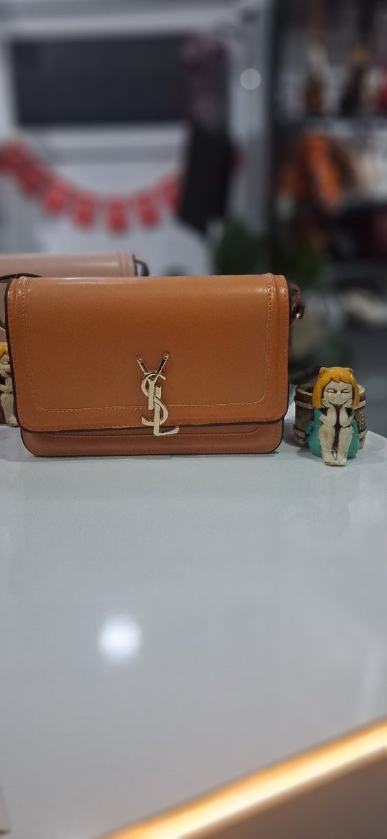 Parlak bej deri kadın çanta, tokalı YSL logosu ve baskılı desenle trendy günlük sokak stiline uygun.