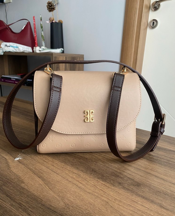 Bej renkte deri çanta, baskılı desen ve tokalı askılarıyla modern klasik tarzda, günlük kullanıma uygundur.