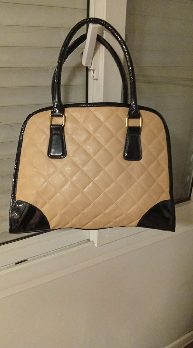 Bej deri gövdeye sahip, siyah parlak saplar ve köşe detayları bulunan kadın çantası. Kapitone deseni ve fermuarlı kapanışı ile klasik zarafeti çağdaş stil ile buluşturuyor. Günlük kullanıma uygun.
