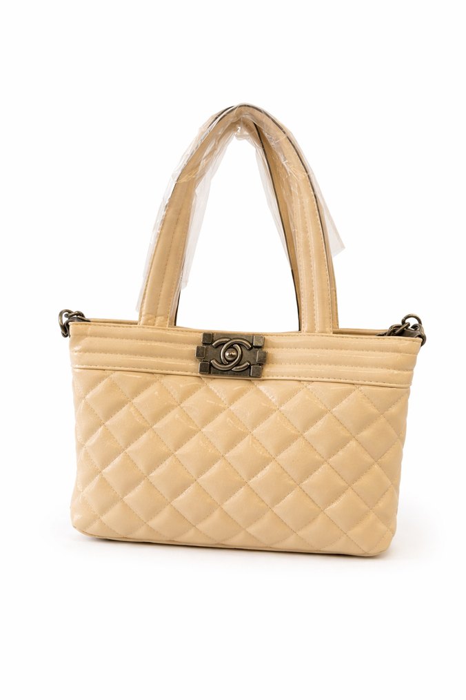 Bej deri kadın çanta, tokalı kapatma ve modern klasik tarzda, günlük kullanıma uygun kapitone desenli. Sabit omuza asmak için zincir askısı mevcuttur