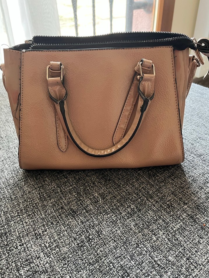 Parlak bej deri kadın çanta, tokalı saplarla minimalist ve çağdaş tasarım, günlük kullanıma uygun.