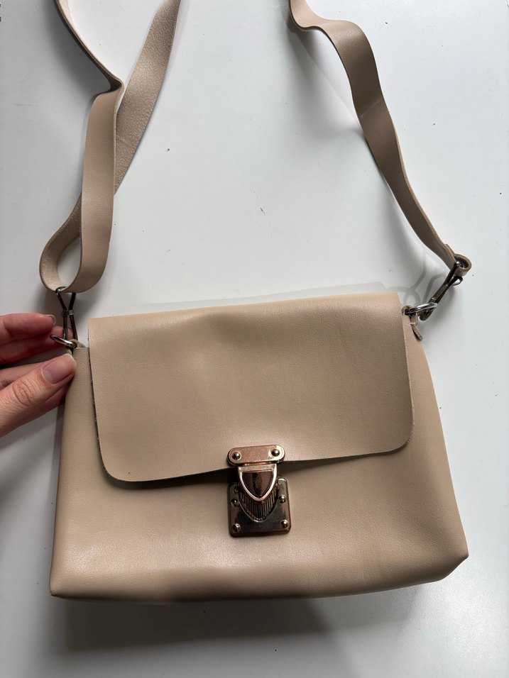 Bej deri kadın çanta, tokalı kapama ve ayarlanabilir askıya sahiptir. Minimalist, desensiz tasarımı günlük kullanım için uygundur.