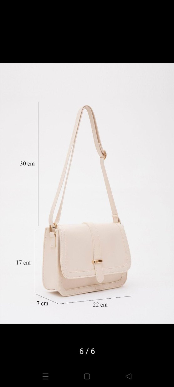 Bej renkte, tokalı deri kadın çantası. Modern klasik stilde, pürüzsüz yüzeye sahip. Ölçüleri 30x22x7 cm, günlük kullanım için uygun.