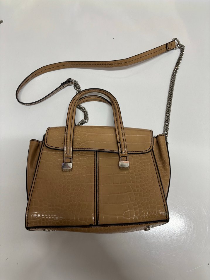 Bej deri kadın çanta, yılan desenli ve tokalı tasarıma sahiptir. Zincir askılı, trend sokak stili için uygundur.