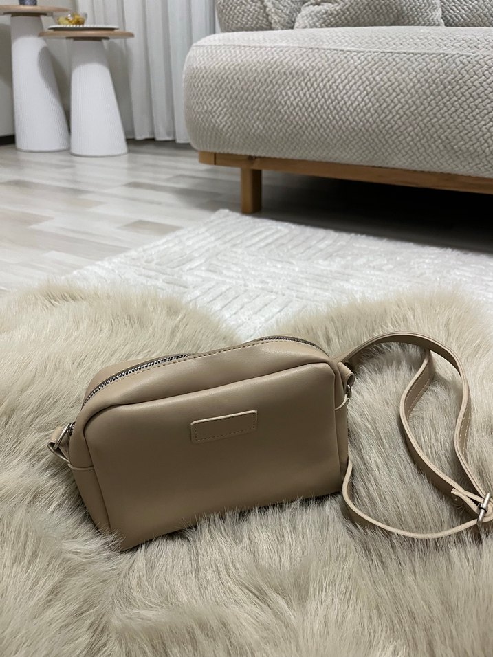 Bej deri kadın çapraz çanta,, desensiz ve sade yüzeyli. Günlük kullanım için şık ve rahat
