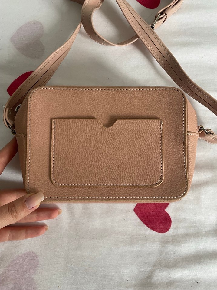 Bej deri çapraz çanta, tokalı askı ve ön cepli, gündelik kullanım için sade ve desensiz tasarıma sahip. Sokak modasına uygun.