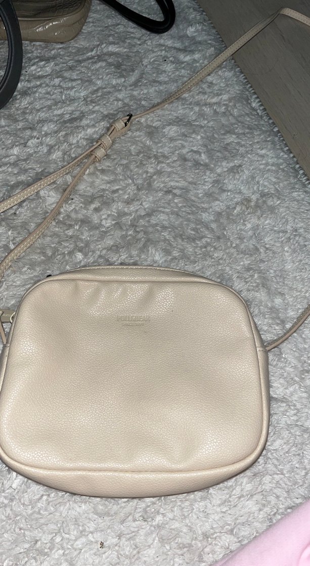Bej deri kadın çapraz çanta, fermuarlı ve ayarlanabilir askılı, günlük kullanıma uygun, trend ve normcore tarzda.