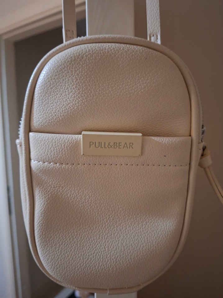 Bej deri çapraz çanta, tokalı ve baskılı PULL&BEAR logosuna sahip. Minimalist tarz, günlük sokak stili için uygun.