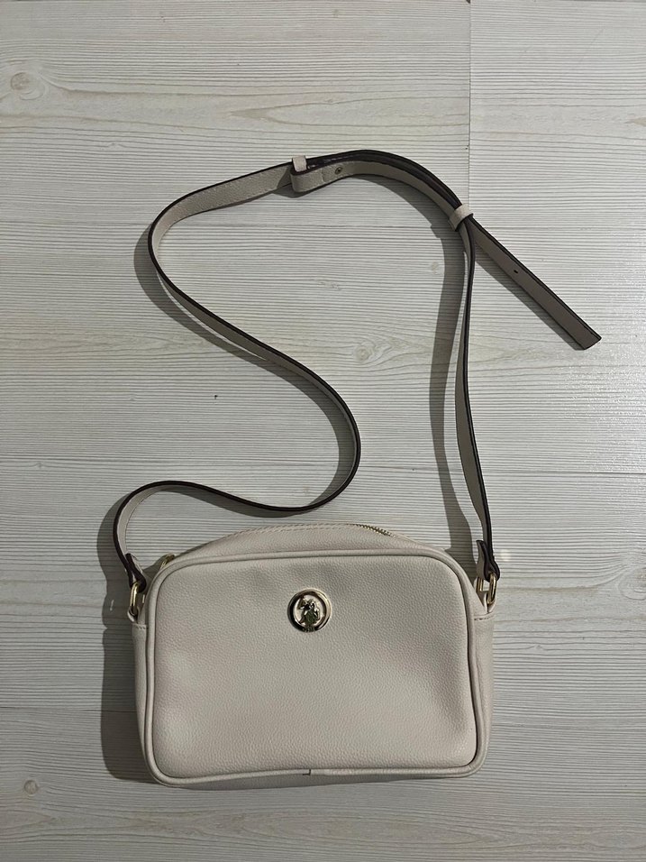 Bej deri çapraz çanta, fermuarlı bölmeli ve ayarlanabilir askılı, günlük kullanım için klasik Paris tarzını yansıtıyor.