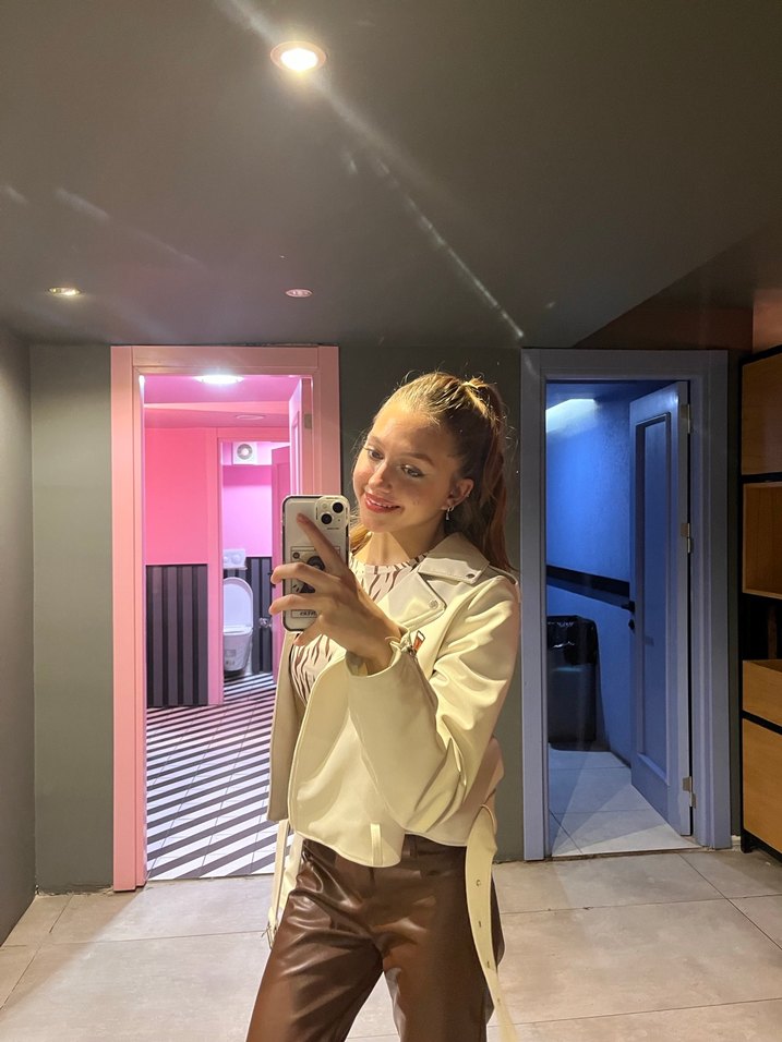 Bej renkli, parlak görünümlü deri kadın ceketi. Notlu yaka ve uzun kollu, midi boy ve regular kesim. Günlük ve sokak stiline uygun. ✨