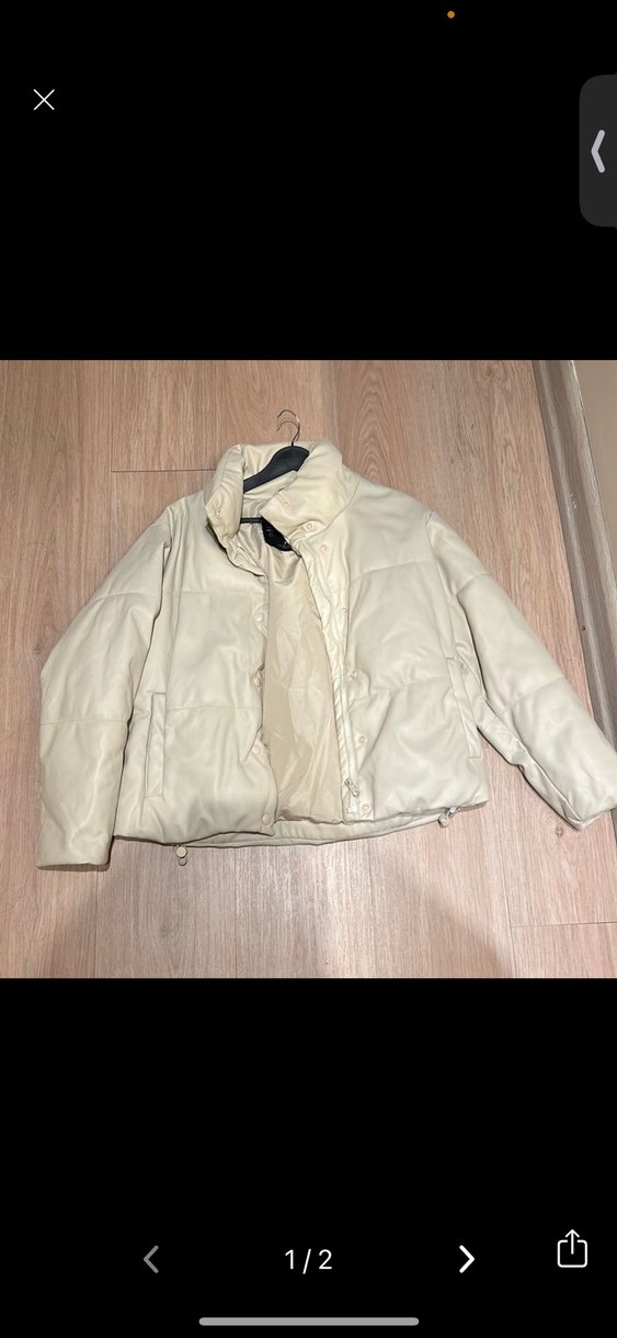 Bej deri mini ceket, yüksek yaka ve düğmeli ön detaylara sahiptir. Bol kesim ve uzun kolludur, günlük rahat sokak stili için uygundur. Desensiz ve konforludur.