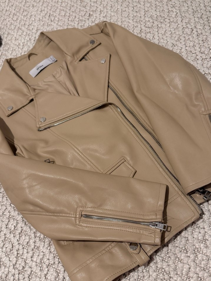 Bej renkli deri ceket, fermuarlı detaylar ve kesik yaka ile regular fit ve askılı kollara sahip. Çok az giyildi defosu yoktur