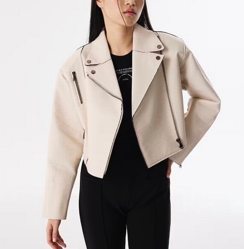 Bej renkli deri ceket, kesik yaka ve uzun kollu tasarıma sahiptir. midi boyu ile günlük kullanıma uygundur.