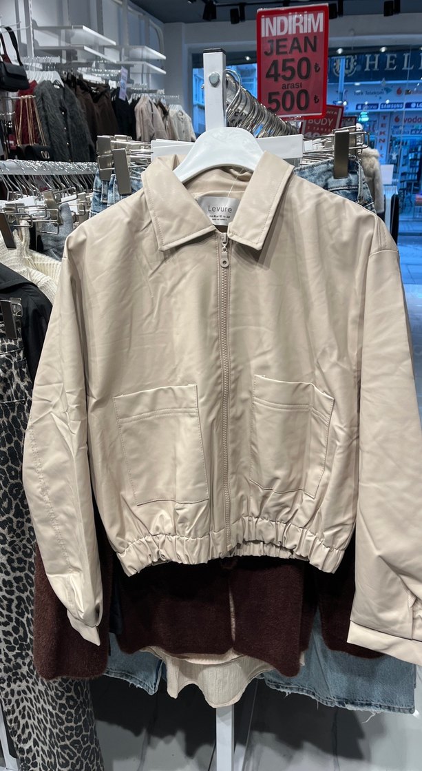 Bej renkli deri kadın ceket, yakalı ve fermuarlı ön yapıya sahiptir. Uzun kollu ve bol kesimdir, elastik bel bandı ile günlük kullanım için uygundur.