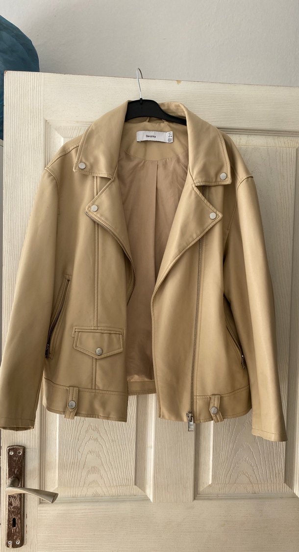 Bej renkli deri ceket, kemerli ve keskin yakalı. Askılı kollu, normal kesim, günlük kullanıma uygun.