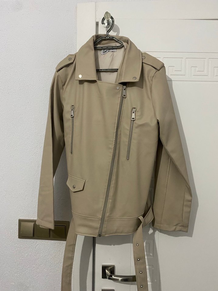 Bej renkli, deri ve fitted kesim kadın ceket. Notlu yaka, uzun kollu ve fermuarlı detaylara sahip midi boy ceket.