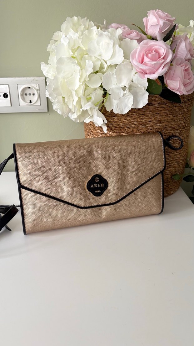 Bej renkli, deri malzemeden yapılmış, bel detaylı ve parlak baskılı modern klasik tarzda kadın clutch çanta. Günlük kullanıma uygundur.