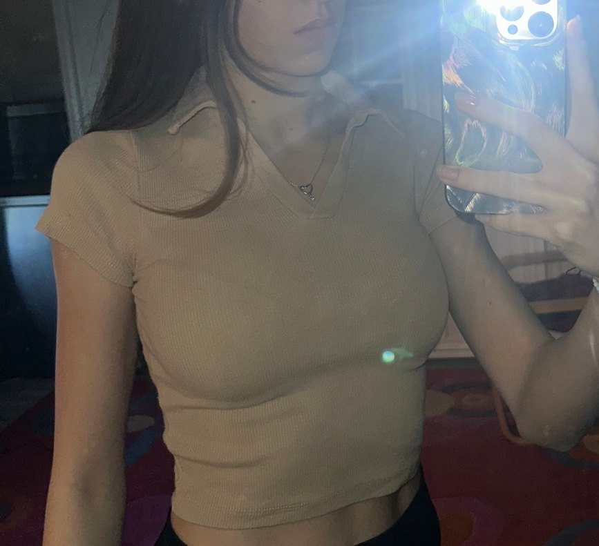 Bej renkli kumas crop top, polo yaka ve kısa kollu. Vücuda oturan kesimiyle günlük sokak stiline uygun, desen içermeyen şık bir parça. Vucuda yapisiyor bol gorunum vermiyor.Ambar